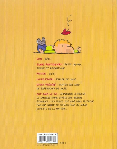 Nom : Rémi. Signes particuliers : petit, blond, timide et romantique, amoureux transi de Julie. Passion : Julie. Loisir favori : parler de Julie. Sport préféré : tenter (en vain) de s'approcher de Julie. But dans la vie : apprendre à parler le langage d'une espèce aux moeurs étranges : les filles. Aidé dans sa tâche par une bande de copains plus ou moins experts en la matière. Ceci est une BD pour les garçons pour mieux comprendre les filles à moins que ce soit le contraire ! Rêveur, un peu poète, un brin philosophe, une élégance décontractée, un côté anti-héros un peu maladroit Olivier Balez et Laurent Richard ont inventé le « style Rémi ». Et nul doute qu'il va faire date ! Les garçons vont se dire : « Mais Rémi, c'est moi ! » et les filles (qui ne sont habilement jamais montrées pour tendre à l'universel) : « Mais la fille qu'il attend, c'est moi ! ». Car ce qui se joue dans Rémi, c'est ce qui se joue tous les jours dans les cours de récré (et ailleurs) : des drames shakespeariens, des passions dévorantes, l'attente fébrile d'un regard, des complots, des confidences, des questionnements philosophiques (« est-ce que je figure dans la liste des garçons préférés de Julie ») en un mot, le grand mystère de l'amour avec un grand « A ». Mais avant tout de l'humour, et plein de malice !