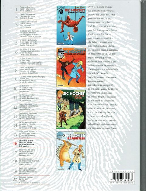 Notre détective préféré aurait-il enfin trouvé un adversaire à sa mesure ? Sinister est un super-criminel qui connaît un peu trop bien la famille Hochet. Après avoir fait disparaître Richard, le père, il s'attaque carrément à Ric qu'il entraîne avec lui dans les limbes de l'au-delà. Mais les cadavres ne refont pas surface un album plus tard pour s'attaquer au marché de l'art... En prime, notre héros devra défendre le FIBD d'Angoulême contre un tueur mystérieux ! Autant de mystères bien embrouillés, qui font le succès de «Ric Hochet» depuis tant d'années... Cet ouvrage est composé des titres suivants : «La Main de la Mort», «Crime sur Internet», «Le Jeu de la Potence» et «BD Meurtres». (Recueil reprenant les titres 59 à 62)