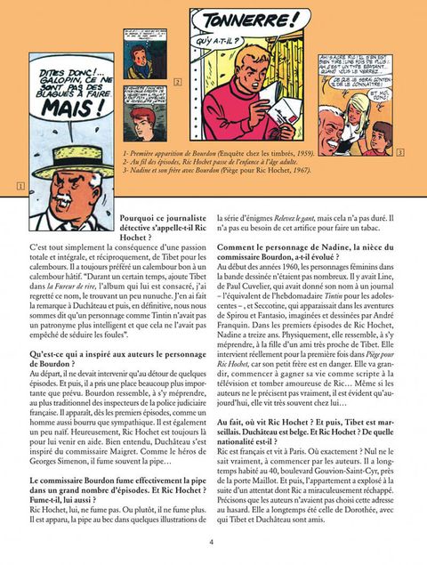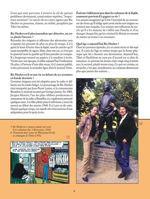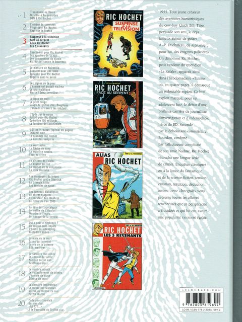 1955. Tout jeune créateur des aventures humoristiques du cow-boy chick bill, tibet persuade son ami, le déjà fameux auteur de polars a. p. duchâteau, de scénariser pour lui des énigmes policières. un dénommé ric hochet, petit vendeur du quotidien " la rafale ", apparaît ainsi dans l'hebdomadaire " tintin " où, en quatre pages, il démasque un redoutable espion. ce bref exploit marque, pour cet adolescent futé, le début d'une brillante carrière de journaliste d'investigation et d'indémodable héros de bd. Secondé par le débonnaire commissaire bourdon, conforté par l'affectueuse complicité de son amie nadine, ric hochet résoudra une longue série de crimes. enquêtes classiques ou à la limite de la science-fiction, tension, émotion, intuition, déduction, action : cette " intégrale " vous présente toutes les affaires ténébreuses que sa perspicacité a élucidées et qui lui ont assuré une popularité rarement égalée.