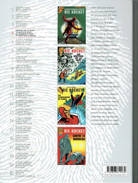1955. Tout jeune créateur des aventures humoristiques du cow-boy chick bill, tibet persuade son ami, le déjà fameux auteur de polars a. p. duchâteau, de scénariser, pour lui, des énigmes policières. un dénommé ric hochet, petit vendeur du quotidien " la rafale ", apparaît ainsi dans l'hebdomadaire " tintin " où, en quatre pages, il démasque un redoutable espion. ce bref exploit marque, pour cet adolescent futé, le début d'une brillante carrière de journaliste d'investigation et d'indémodable héros de bd. Secondé par le débonnaire commissaire bourdon, conforté par l'affectueuse complicité de son amie nadine, ric hochet résoudra une longue série de crimes. enquêtes classiques ou à la limite du fantastique et de la science-fiction, tension, émotion, intuition, déduction, action : cette " intégrale " vous présente toutes les affaires ténébreuses que sa perspicacité a élucidées et qui lui ont assuré une popularité rarement égalée.