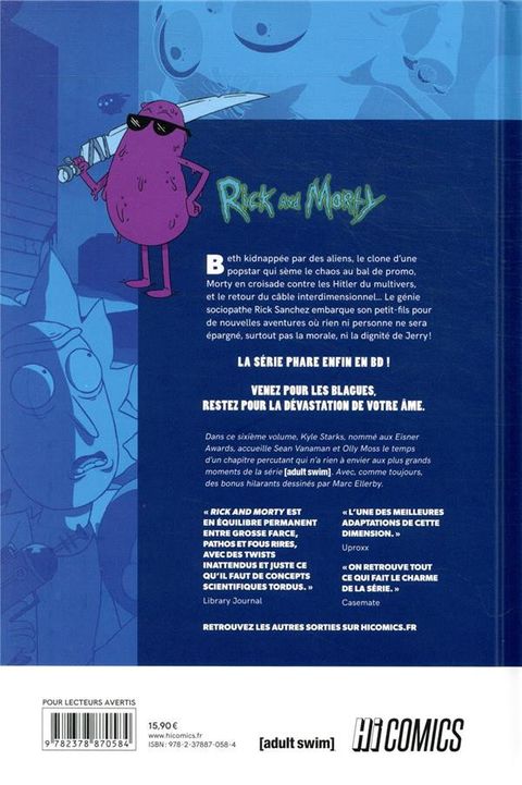 Rick et Morty pour toujours et à jamais, Rick et Morty sur tous les fronts !Beth kidnappée par des aliens, le clone d'une popstar qui sème le chaos au bal de promo, Morty en croisade contre les Hitler du multivers, et le retour du câble interdimensionnel... Le génie sociopathe Rick Sanchez embarque son petit-fils pour de nouvelles aventures où rien ni personne ne sera épargné, surtout pas la morale, ni la dignité de Jerry !La série phare enfin en BD ! Venez pour les blagues, restez pour la dévastation de votre âme.Dans ce sixième volume, Kyle Starks, nommé aux Eisner Awards, accueille Sean Vanaman et Olly Moss le temps d'un chapitre percutant qui n'a rien à envier aux plus grands moments de la série Adult Swim. Avec, comme toujours, des bonus hilarants dessinés par Marc Ellerby."L'une des meilleures adaptations de cette dimension." Uproxx"Rick and Morty est en équilibre permanent entre grosse farce, pathos et fou-rires, avec des twists inattendus et juste ce qu'il faut de concepts scientifiques tordus." Library Journal"On retrouve tout ce qui fait le charme de la série." Casemate