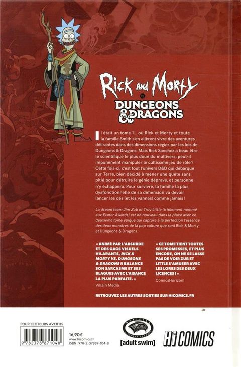 Le combo magique est de retour ! Il était un tome 1... où Rick et Morty et toute la famille Smith s'en allèrent vivre des aventures épiques et délirantes dans des dimensions régies par les lois de Dungeons & Dragons. Mais Rick Sanchez a beau être le scientifique le plus doué du multivers, peut-il impunément manipuler le cultissime jeu de rôles ? Cette fois-ci, c'est tout l'univers D&D qui débarque sur Terre, bien décidé à mener une quête sans pitié pour détruire le génie dépravé, et personne n'y échappera. Pour survivre, la famille la plus dysfonctionnelle de sa dimension va devoir lancer les dés (et les vannes) comme jamais ! La dream team Jim Zub et Troy Little (triplement nommé aux Eisner Awards) est de nouveau dans la place avec ce deuxième tome épique qui capture à la perfection l'essence des deux monstres de la pop culture que sont Rick & Morty et Dungeons & Dragons. "Animé par l'absurde et des gags visuels hilarants, Rick & Morty vs. Dungeons & Dragons balance son sarcasme et ses blagues avec l'aisance la plus parfaite". Villain Media "Ce tome tient toutes ses promesses, et plus encore, on ne se lasse pas de voir Zub et Little s'amuser avec les lores des deux licences ! " ComicsHorizon !