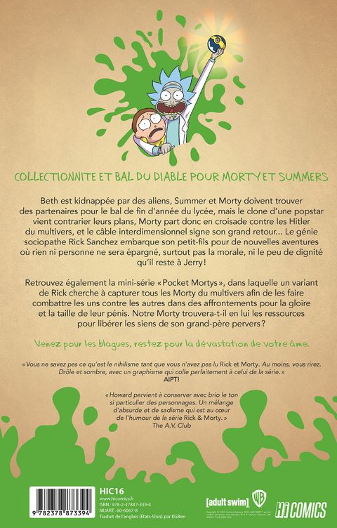 Collectionnite et bal du diable pour Morty et Summer !Beth est kidnappée par des aliens, Summer et Morty doivent trouver des partenaires pour le bal de fin d'année du lycée, mais le clone d'une popstar vient contrarier leurs plans, Morty part donc en croisade contre les Hitler du multivers, et le câble interdimensionnel signe son grand retour... Le génie sociopathe Rick Sanchez embarque son petit-fils pour de nouvelles aventures où rien ni personne ne sera épargné, surtout pas la morale, ni le peu de dignité qu'il reste à Jerry ! Retrouvez également la mini-série Pocket Mortys, dans laquelle un variant de Rick cherche à capturer tous les Morty du multivers afin de les faire combattre les uns contre les autres dans des affrontements pour la gloire et la taille de leur pénis. Notre Morty trouvera-t-il en lui les ressources pour libérer les siens de son grand-père pervers ? Venez pour les blagues, restez pour la dévastation de votre âme. - Nouvelle intégrale de Rick & Morty qui réunit l'équivalent du Tome 6 de la première série régulière et le hors-série Pocket Mortys : Soumettez les Tous ! - Pocket Mortys, une parodie drôle et grinçante de Pokémon, qui a donné lieu à une application mobile du même nom et des cartes à jouer ! - Kyle Starks (nommés aux prestigieux Eisner Awards) et Tini Howard viennent s'emparer avec brio de l'univers de Rick & Morty dans des comics qui peuvent être lus par les amateurs de la série comme par ceux qui la découvrent.