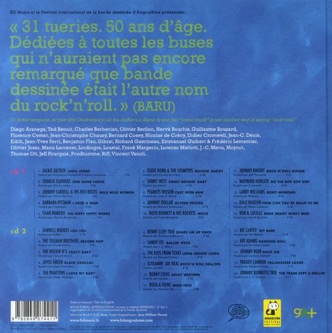 Les dessinateurs : D. Aranega, T. Benoit, C. Berberian, O. Berlion, H. Bourhis, Bouzard, JC. Chauzy, N. de Crécy, JC. Denis, B. Flao, R. Guerineau, E. Guibert, M. Larcenet, F. Margerin, JC. Menu, E. Moynot, J. Pourquié, D. Prudhomme, JM. Rochette, F. Cestac, Loustal, JY Ferri, B. Cosey, Y. Lindingre, Igort, L.Mattotti. " Je suis allé à la pêche dans ma collection de compilations de Rock'n'roll et j'ai réuni trente, quarante titres, tous bien allumés, et obscurs -cela va de soi, sinon quel intérêt ?, enregistrés entre entre 1954 et le début des années 60. Il y aurait deux rondelles. Et un livret, somptueux, qui dépendrait de vous. L'idée, c'est "un titre - une illustration", avec une exposition des originaux au CNBDI pendant le festival. Le dessin est au format carré, couleur ou non, 20 cm x 20 cm à l'impression. Pour donner une colonne vertébrale au bazar, je vous propose de revisiter l'imagerie générée par l'irruption du Rock'n'roll à l'époque : celle du mauvais garçon, cran d'arrêt en pogne et dégoulinant de testostérone, dont les compilations Rhino ont fait leurs choux gras, par exemple. Ça vous dit ? Oui ? Formidable! " Baru