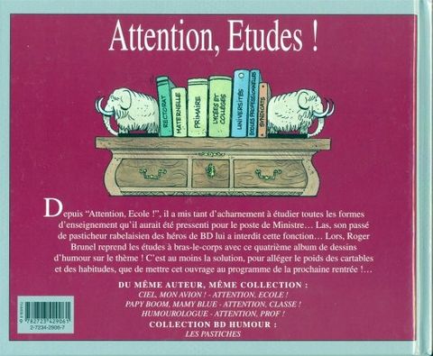 Depuis Attention, école !, il a mis tant d'acharnement à étudier toutes les formes d'enseignement qu'il aurait été pressenti pour le poste de ministre... Las ! Son passé de pasticheur rabelaisien des héros de BD lui a interdit cette fonction... Lors, Roger Brunel reprend les études à bras-le-corps avec ce quatrième album de dessins d'humour sur le thème ! C'est au moins la solution pour alléger le poids des cartables et des habitudes que de mettre cet ouvrage au programme de la prochaine rentrée !