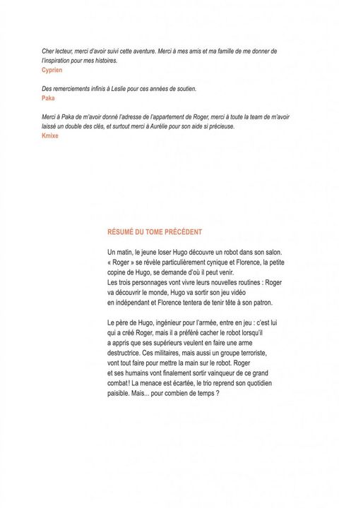 Roger, le robot intelligent, a fini par apprivoiser son loser d'humain, Hugo. Sans pour autant oublier la tendance de ce dernier à préférer la PLS à Pôle emploi et la PS4 aux soirées entre amis. Finalement largué par sa copine, Hugo n'est pas au bout de ses peines... Surtout lorsque la nouvelle invention de son père, un Roger 2.0, mais en moins bien, se transforme en arme de destruction massive entre les mains d'un terroriste corrompu. Pour Roger devenu le robot à abattre et Hugo, ce n'est que le début des ennuis. L'aventure ne se jouera finalement peut-être plus derrière un écran de console ! Cyprien, le célèbre youtubeur et phénomène web, nous offre la suite des péripéties de Roger et ses humains, où absurde, geek attitude et vannes ininterrompues forment un cocktail explosif ! Aux côtés de Paka au dessin, il continue de nous régaler avec ces strips indépendants mâtinés de références pop culture et bourrés d'humour. C'est certain, les mésaventures de ces héros authentiques et attachants ne laisseront personne en reste !