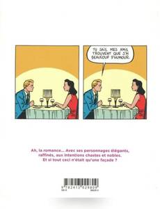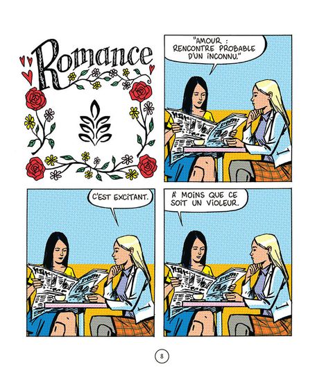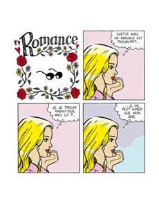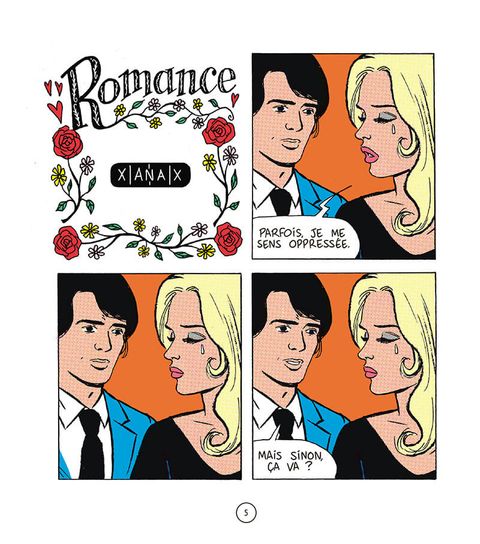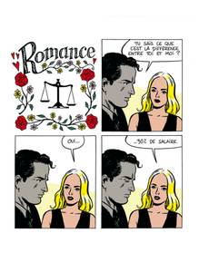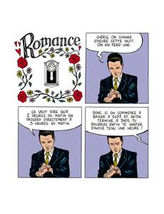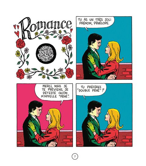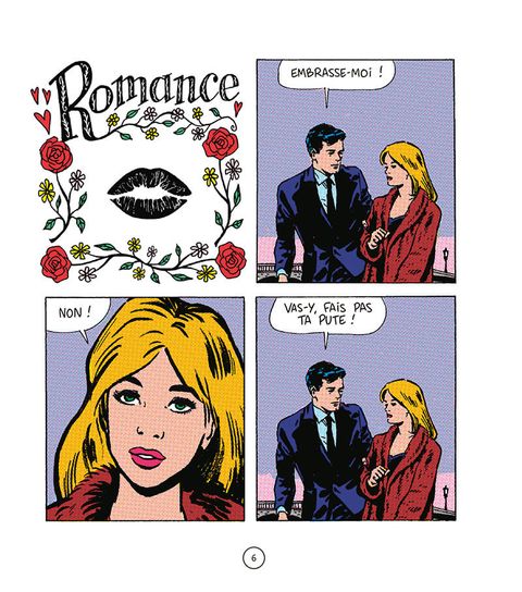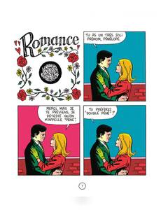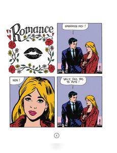 Ah, la romance. Avec ses personnages élégants, raffinés, aux intentions chastes et nobles. Mais tout ceci n'est qu'une façade. Et toutes les intentions ne sont pas avouables dans une relation amoureuse, loin de là. Tout est beau, tout est doux, on baigne dans l'amour romanesque, épique, aseptisé. Mais, tout en jouant sur l'esthétique vintage et élégante des comédies romantiques de l'âge d'or des comics, type Young Romance de Kirby, popularisée par la suite par Roy Lichtenstein, Elric prête à ses personnages un langage et des intentions bien contemporains, voire crus, et fait craquer le vernis de la romance.