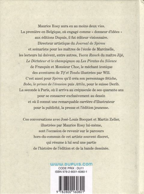 Engagé chez Dupuis comme "donneur d'idées", Maurice Rosy a été l'un des piliers du Journal de Spirou dans les années 1960, période pendant laquelle il est à la fois directeur artistique et scénariste, avant d'entamer une nouvelle carrière d'illustrateur de presse et de jeunesse dans les années 1970. Cette autobiographie, présentée sous la forme d'entretiens réalisés par José-Louis Bocquet et illustrée en grande partie de crayonnés de l'auteur, revient sur le parcours atypique de cet artiste aux talents multiples, auquel on doit, entre autres, la création du redoutable M. Choc.