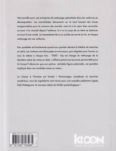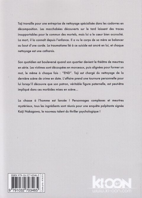 Taji travaille pour une entreprise de nettoyage spécialisée dans les cadavres en décomposition. Les macchabées découverts sur le tard laissent des traces insupportables pour le commun des mortels, mais lui a le coeur bien accroché. La mort, il la connaît depuis l'enfance. Il a vu le corps de sa mère se balancer au bout d'une corde. Le traumatisme lié à ce suicide est ancré en lui, et chaque nettoyage est une catharsis. Son quotidien est bouleversé quand son quartier devient le théâtre de meurtres en série. Les victimes sont découpées en morceaux, puis alignées pour former un mot, le même à chaque fois : «END». Taji est chargé du nettoyage de la dernière scène de crime en date. L'affaire prend une tournure personnelle pour lui lorsqu'il découvre que son patron, véritable figure paternelle, est peut-être impliqué dans ces morbides mises en scène... La chasse à l'homme est lancée ! Personnages complexes et meurtres mystérieux, tous les ingrédients sont réunis pour une enquête palpitante signée Kaiji Nakagawa, le nouveau talent du thriller psychologique !
