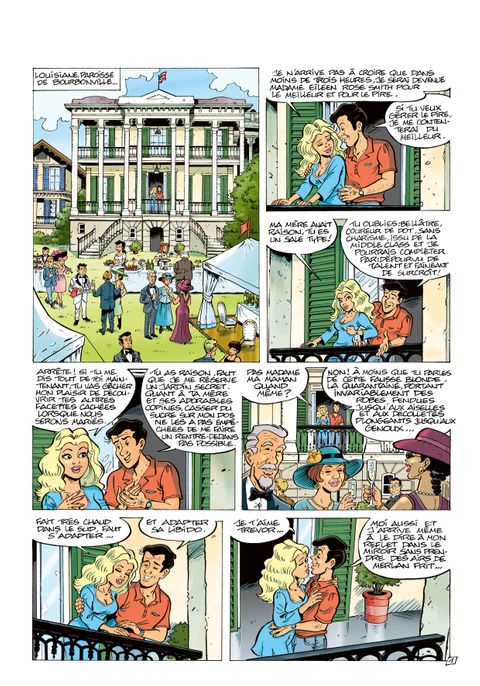Bourbonville, paroisse de Louisiane cernée de bayous, s'apprête à vivre l'événement mondain de l'année : le mariage de Eileen Lerouge avec Trevor Smith ... un Yankee ! La soirée s'annonce festive sauf qu'à l'instant fatidique, le futur marié et sa famille ont disparu. les pistes suivies par le shérif local ne font qu'épaissir le mystère. Le seul Trevor Smith dont on retrouve la trace est mort depuis des lustres. Les années passent lorsque Eileen découvre l'oncle de Trevor jouant dans une pub la télé. Il existe une version Ulule de ces albums embossés "Premier tirage" et signés par les auteurs. Avec en plus un marque page et un ex-libris A5 signé par Bruno Di Sano