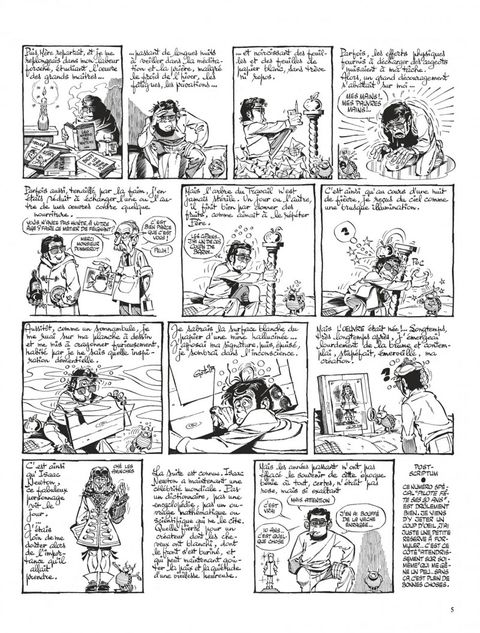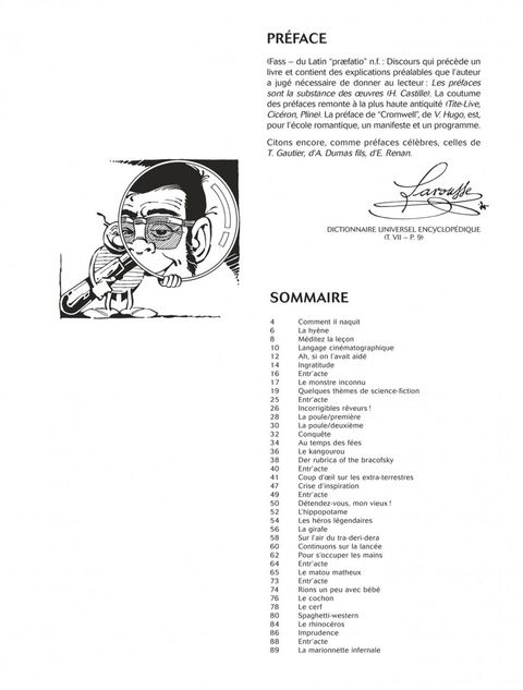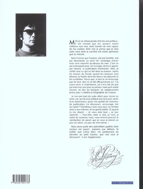 Moi, je ne refuse jamais d'écrire une préface ; il est normal que les auteurs moins célèbres que moi, aient besoin de mon appui, de ma caution. Bref, moi je pense que je dois aider ceux dont la carrière est moins glorieuse que la mienne. mais il arrive que l'auteur, soit par timidité, soit par étourderie, se prive de l'avantage d'avoir mon nom imprimé au-dessus du sien. c'est ce qui s'est passé pour cet ouvrage, dont j'ai appris, par hasard, la publication imminente. (moi, je vérifie tout ce qui se fait dans la maison. après les heures de travail, quand les bureaux sont déserts, je fouille dans les tiroirs, les placards et les corbeilles. Parce que, si moi je ne m'occupe pas de tout, rien ne se fait efficacement, ici). j'ai couru donc à l'imprimerie, où il m'a été dit que j'arrivais trop tard pour la préface, mais qu'il restait encore, au dos du bouquin, un emplacement prévu pour y mettre la biographie de l'auteur. je me suis tout de suite offert pour écrire ce texte, car, qui de plus indiqué que moi pour parler d'un dessinateur, qu'en ma qualité de directeur de publication, j'ai découvert, encouragé, tiré du néant ? nombreux sont ceux que j'ai révélés ainsi à eux-mêmes, et au grand public. Et quand ils me disent : " je vous dois tout ", je leur réponds : " peut-être, mais si moi, je vous ai sortis du ruisseau, vous, vous m'avez procuré la satisfaction de savoir que je vous ai donné un peu de talent, un peu de moi-même. " mais assez parlé des splendides qualités dont l'auteur est pourri ; passons aux défauts. et gotlib, que j'aime bien, me pardonnera de dévoiler un petit travers, que moi seul ai découvert : il est mégalomane.