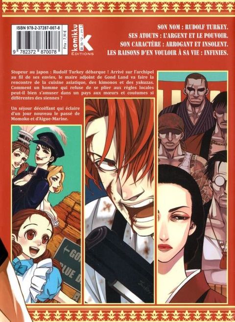 «Saviez-vous que de tous les gens qui ont braqué une arme sur Rudolf Turkey, aucun ne s'en est jamais sorti indemne ?» États-Unis, années 50. Rudolf a une conception toute personnelle de la justice. Adjoint au maire de la métropole Gond Land, il aime l'argent, le pouvoir et les femmes. Découvrez le quotidien hors du commun de cet homme aux appétits insatiables et aux ennemis innombrables. Une aventure palpitante et jubilatoire ! Adjoint au maire de Gond Land, Rudolf Turkey est riche, puissant et n'en fait qu'à sa tête quand il s'agit de justice ou de femmes. Une attitude qui lui vaut bon nombre de problèmes et d'ennemis : patrons de casinos, mafias chinoises, trafiquants de drogues. Tous ont des raisons de lui en vouloir. Mais gare à qui décide de s'en prendre à lui ! De l'action, de l'amour et des répliques cinglantes, des aventures rocambolesques dépeignant une Amérique des années 50 plus vraie que nature.