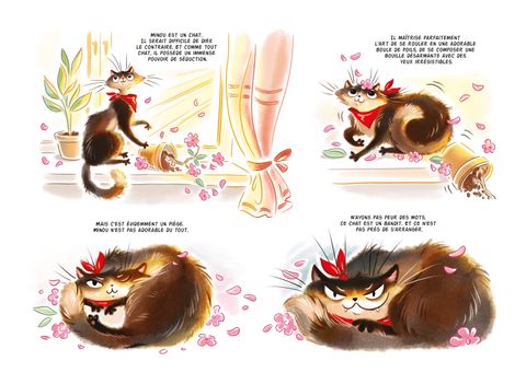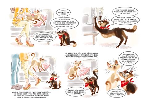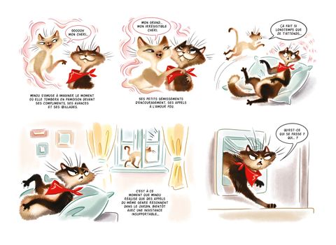 Minou vit un horrible cauchemar : SON humain Jean s’est amouraché d’une humaine qui est venue emménager dans SA maison… flanquée, en plus, d’une délicate chatte siamoise ! Cette fois, c’est en trop. L’horrible minet décide de séduire la belle pour mieux circonscrire la menace, mais c’est sans compter la romance qu’elle entretient déjà avec un énorme chat roux. Bref, à trop vouloir manipuler son monde, notre adorable Minou risque de s’attirer un léger retour de manivelle et quelques coups de griffes… Mais croyez-vous vraiment que cela puisse le rendre moins machiavélique ?