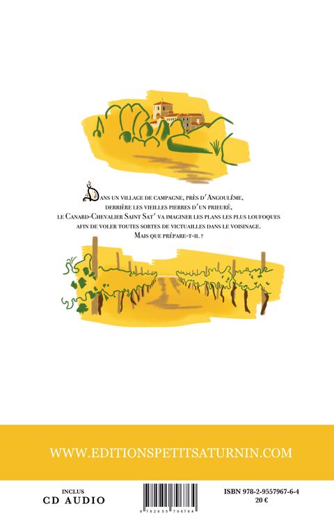 Dans un village de campagne, près d'Angoulême, derrière les vieilles pierres d'un prieuré, le Canard-Chevalier Saint Sat' va imaginer les plans les plus loufoques afin de voler toutes sortes de victuailles dans le voisinage. Mais que prépare-t-il ? Une histoire au service du patrimoine français. Bonus en réalité augmentée (documents d'archive)