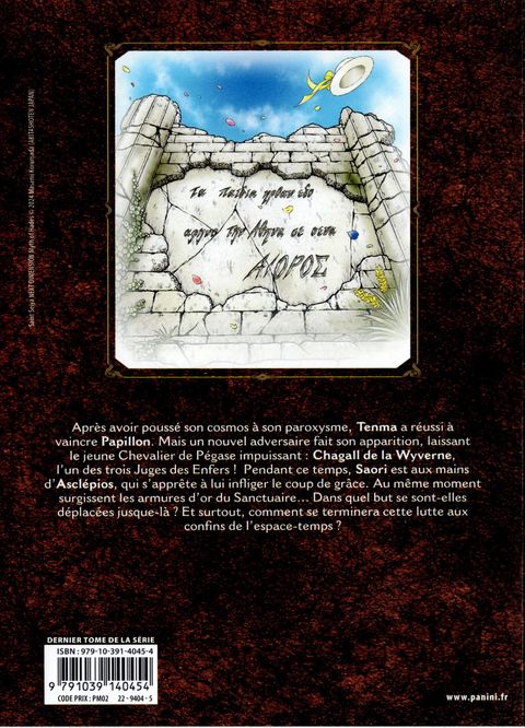 Après avoir porté son cosmos à son apogée, Tenma parvient à terrasser Papillon. Mais déjà un nouvel ennemi se dresse devant lui, et pas des moindres : Chagall de la Wyverne, l'un des redoutables trois Juges des Enfers ! Impuissant face à cet adversaire redoutable, le jeune chevalier de Pégase vacille... Pendant ce temps, Saori est entre les mains d'Asclépios, prêt à lui porter le coup de grâce ! C'est alors que surgissent les armures d'or du Sanctuaire... mais pourquoi sont-elles venues jusqu'ici ? Aux confins de l'espace-temps, la bataille touche à sa fin... Quelle sera l'issue de cet affrontement ultime ?!