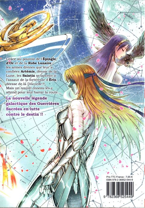 Grâce au pouvoir de l'Épingle d'Or et de la Robe Lunaire, les armes divines que leur a confiées Artémis, déesse de la Lune, les Saintia se lancent à l'assaut de la forteresse d'Éris, déesse de la Discorde !! Mais un nouvel ennemi les y attend pour leur barrer la route... !! La nouvelle légende galactique des Guerrières Sacrées en guerre contre le destin !!