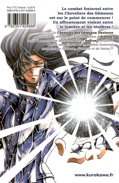 Le combat fraternel entre les Chevaliers des Gémaux est sur le point de commencer ! Un affrontement violent entre la lumière et les ténèbres ! Le chevalier des Gémaux Deuteros a réussi à récupérer l'armure divine d'Athéna, mais il se retrouve face à son frère, Apros le traître ! Quelle sera l'issue de ce combat fraternel empreint de tristesse, d'amour et de haine ?!