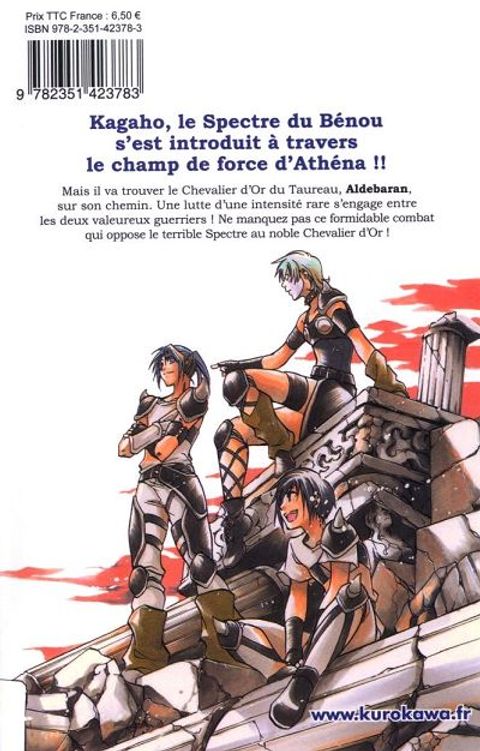 Kagaho, le spectre du Bénou s'est introduit à travers le champ de force d'Athéna !! Mais il va trouver le Chevalier d'Or du Taureau, Aldebaran, sur son chemin. Une lutte d'une intensité rare s'engage entre les deux valeureux guerriers ! Ne manquez pas ce formidable combat qui oppose le terrible Spectre au noble Chevalier d'Or !
