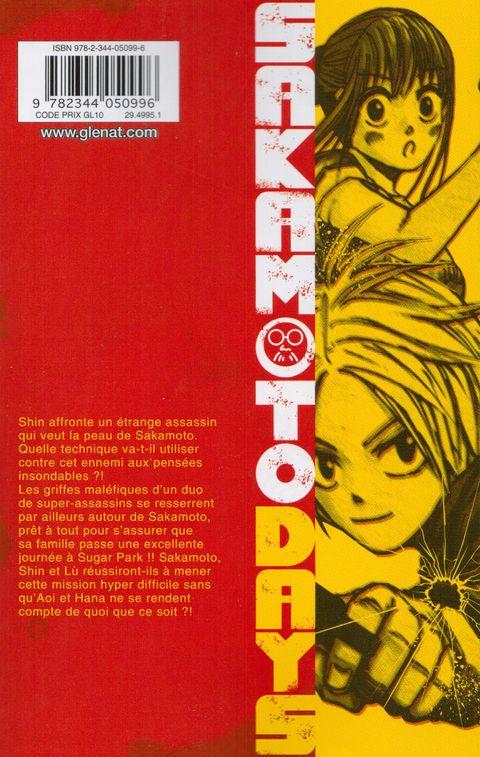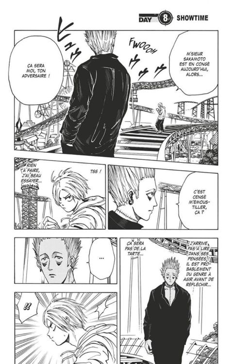 Shin affronte un étrange assassin qui veut la peau de Sakamoto. Quelle technique va-t-il utiliser contre cet ennemi aux pensées insondables ?! Les griffes maléfiques d’un duo de super-assassins se resserrent par ailleurs autour de Sakamoto, prêt à tout pour s’assurer que sa famille passe une excellente journée à Sugar Park !! Sakamoto, Shin et Lù réussiront-ils à mener cette mission hyper difficile sans qu’Aoi et Hana ne se rendent compte de quoi que ce soit ?!