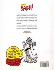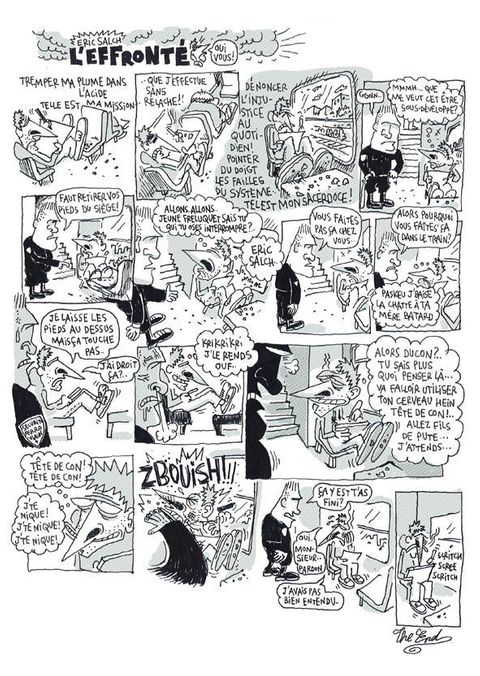 Prenez un chat psychopathe nommé Troufignon, une adorable peluche défoncée à la 8.6, une méthode de régime révolutionnaire, un joint qui parle, des birkenstoks avec des chaussettes blanches de sport, un éditeur érotomane en peignoir mauve, des collègues de travail dans leur intimité la plus sordide, des suppositoires en kimono, des angoisses existentielles... Secouez bien le tout, ajoutez une rondelle de citron pour la couleur et dégustez l'univers truculent, provocant et hilarant du cerveau de Eric Salch. Ne pas dépasser la dose prescrite.