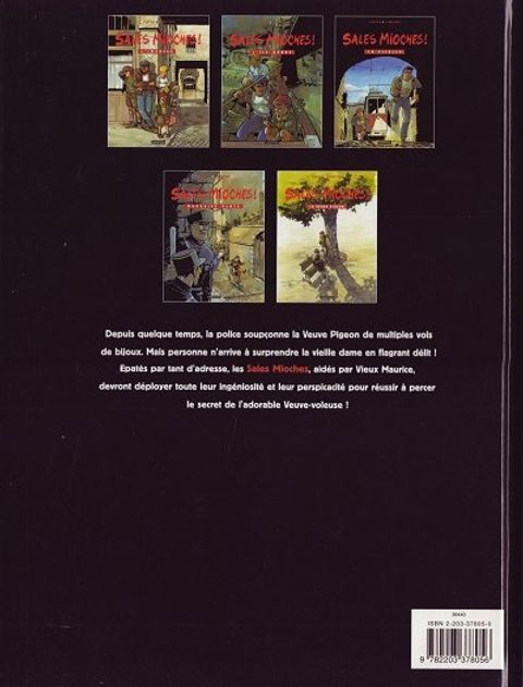 Depuis quelque temps, la police soupçonne la Veuve Pigeon de multiples vols de bijoux. Mais personne n'arrive à surprendre la vieille dame en flagrant délit ! Epatés par tant d'adresse, les Sales Mioches, aidés par Vieux Maurice, devront déployer toute leur ingéniosité et leur perspicacité pour réussir à percer le secret de l'adorable Veuve-voleuse !