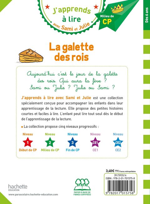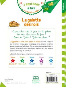 <em>Aujourd’hui c’est le jour de la galette des rois. </em><em>Alors, qui aura la fève ? Sami ou Julie ? Julie ou Sami ?</em>  Ce niveau 2 (milieu de CP) permet de travailler spécifiquement la lecture des sons (gu) et (j).«  J’apprends à lire avec Sami et Julie  » est une collection de petites histoires spécialement conçue pour les enfants apprenant à lire. Le texte est écrit en gros, les mots sont bien détachés les uns des autres et les lignes bien espacées. Les histoires sont courtes, drôles et très faciles à lire. Écrites avec des mots en adéquation avec leur progression, une quantité de texte à lire réduite et adaptée, pour que l’enfant reste motivé et prenne confiance.
