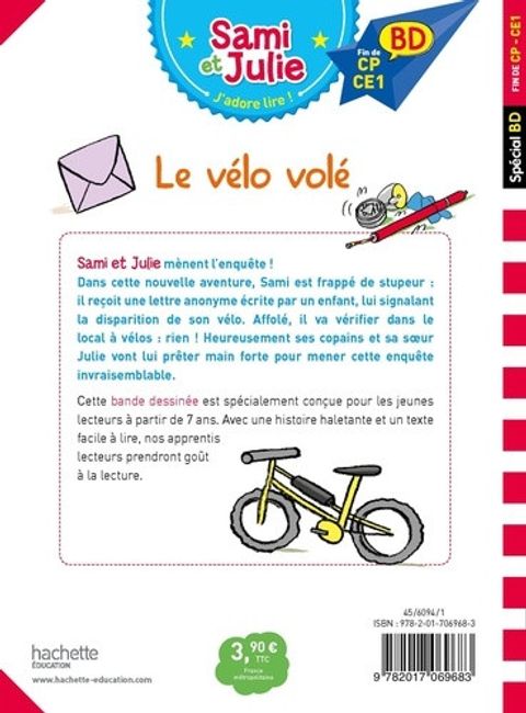 Sami et Julie Mènent L’enquête ! dans cette Nouvelle Aventure, Sami Est Frappé de Stupeur : il Reçoit une Lettre Anonyme Ecrite par un Enfant, Lui Signalant la Disparition de son Vélo. Affolé, il Va Vérifier dans le Local à Vélos : Rien ! Heureusement ses Copains et sa Sœur Julie Vont Lui Prêter Main Forte pour Mener L’enquête !cette Bande Dessinée Est Spécialement Conçue pour les Jeunes Lecteurs à Partir de 7 Ans. avec une Histoire Haletante et un Texte Facile à Lire, nos Apprentis Lecteurs Prendront Goût à la Lecture.