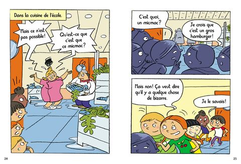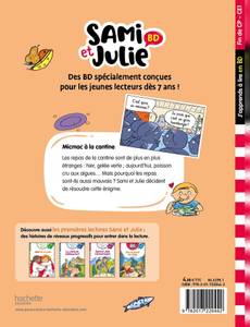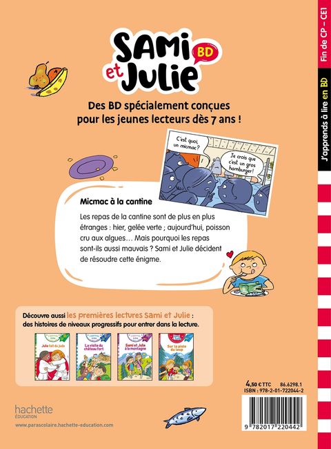 Micmac à la cantineLes repas de la cantine sont de plus en plus étranges : hier, gelée verte ; aujourd’hui, poisson cru aux algues… Mais pourquoi les repas sont-ils aussi mauvais ? Sami et Julie décident de résoudre cette énigme. Cette bande dessinée est spécialement conçue pour les jeunes lecteurs à partir de 7 ans. Avec une histoire haletante et un texte facile à lire, nos apprentis lecteurs prendront goût à la lecture.