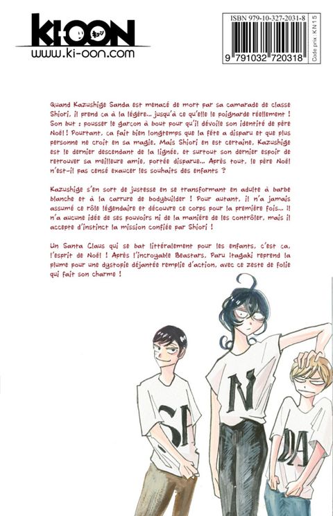 Le père Noël revient... avec un corps de lutteur et une âme d'enfant !Quand Kazushige Sanda est menacé de mort par sa camarade de classe Shiori, il prend ça à la légère... jusqu'à ce qu'elle le poignarde réellement ! Son but : pousser le garçon à bout pour qu'il dévoile son identité de père Noël ! Pourtant, ça fait bien longtemps que la fête a disparu et que plus personne ne croit en sa magie. Mais Shiori en est certaine, Kazushige est le dernier descendant de la lignée, et surtout son dernier espoir de retrouver sa meilleure amie, portée disparue... Après tout, le père Noël n'est-il pas censé exaucer les souhaits des enfants ? Kazushige s'en sort de justesse en se transformant en adulte à barbe blanche et à la carrure de bodybuilder ! Pour autant, il n'a jamais assumé ce rôle légendaire et découvre ce corps pour la première fois... Il n'a aucune idée de ses pouvoirs ni de la manière de les contrôler, mais il accepte d'instinct la mission confiée par Shiori ! Un Santa Claus qui se bat littéralement pour les enfants, c'est ça, l'esprit de Noël ! Après l'incroyable Beastars, Paru Itagaki reprend la plume pour une dystopie déjantée remplie d'action, avec ce zeste de folie qui fait son charme !
