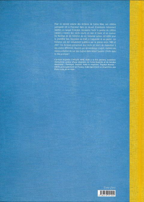 Un florilège d'histoires inédites de Saubón, de l'immense dessinateur argentin. Pour ce second volume des Archives de Carlos Nine, son célèbre canard Saubón est à l'honneur. Toutes les histoires présentées dans ce recueil sont totalement inédites en langue française. L'oeuf de Cu-Cu et Le Coiffeur de Saubón dessinées pour le magazine Fierro en Argentine, sont dessinées à l'aquarelle, et même à la pastel pour la seconde histoire. Ces Archives montrent pour la première fois des histoires en cours de réalisation à des stades différents, illustrées par de nombreux croquis et pages en noir & blanc et couleur. Saubón Sunday Pages, propose une variation d'histoires en deux couleurs. Enfin la masterpiece de ces Archives est une réinterprétation du Lac des Cygnes dans lequel Saubón s'invite dans le rôle principal, celui du cygne