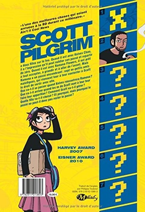 La vie de Scott Pilgrim est géniale. Il a vingt-trois ans, il joue dans un groupe de rock, il est « entre deux boulots », et il sort avec une mignonne petite lycéenne. Tout est fabuleux jusqu'au moment où une livreuse en rollers nommée Ramona Flowers, sérieusement atomique et dangereusement trendy, commence à traverser ses rêves et à le croiser à des fêtes. Mais le chemin qui mène à Mlle Flowers n'est pas couvert de pétales de roses. Ses sept ex-petits amis maléfiques barrent la route du véritable bonheur de Scott. Pourra-t-il vaincre les méchants et gagner le coeur de cette fille sans chambouler intégralement sa précieuse petite vie ? Retrouvez la série Scott Pilgrim dans une nouvelle édition grand format cartonnée et entièrement colorisée !
