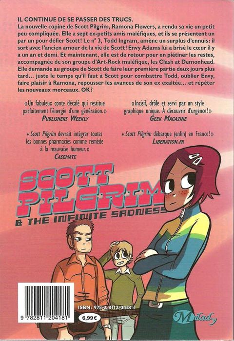 Scott Pilgrim, vous vous souvenez ? Le mec le plus cool de l'univers. Un branleur de vingt-trois ans qui espère devenir une star et joue dans un groupe de rock. Et complètement fou amoureux de Ramona Flowers. Mais pour sortir avec l'élue de son coeur, Scott doit battre en duel ses sept ex maléfiques. Scott Pilgrim, c'est un jeu vidéo grandeur nature... Le croisement improbable d'Adrian Tomine (Les Yeux à vif) et Akira Toriyama (Dragon Ball).