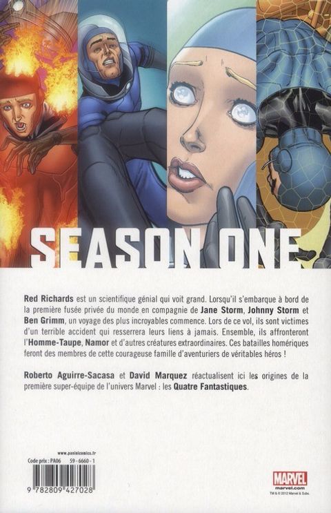 Après spider-man au mois de juillet, c'est au tour des Quatre fantastiques d'avoir l'honneur d'apparaître dans la collection Season One, une formidable initiative de Marvel pour faire découvrir ses plus grands super-héros à une nouvelle génération de lecteurs. Voici donc la version la plus récente et la plus actuelle des origines de la Première Famille de l'univers Marvel... mais pas seulement ! Vous assisterez à leurs premiers affrontements, contre l'Homme-Taupe, le Docteur fatalis... et namor, le Prince des Mers. aguirre-sacasa et marquez sont aux rênes de ce magnifique album.