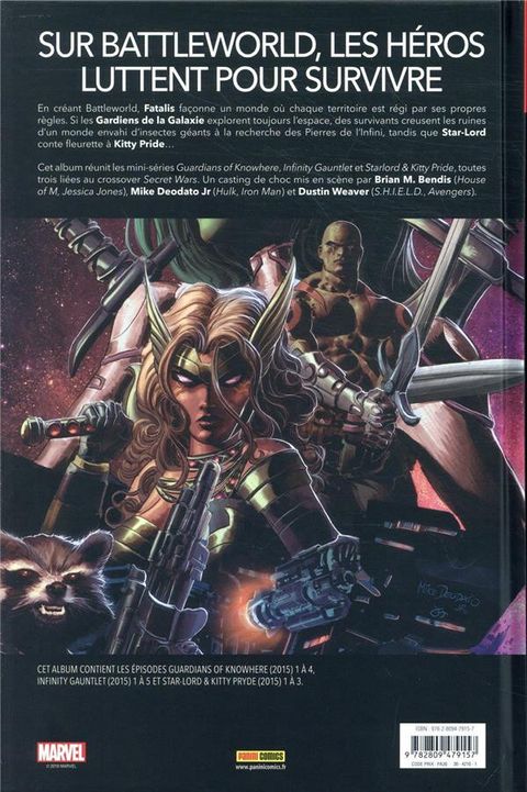 Les lecteurs apprécient particulièrement les versions alternatives de héros connus, un exercice auquel se livrent ici certains des artistes les plus renommés de la Maison des Idées. Durant Secret Wars, chaque zone du monde Battleworld était une réalité indépendante. Cet album livre trois récits sur les différentes versions des Gardiens de la Galaxie et de Thanos : Guardians of Knowhere (Brian M. Bendis et Mike Deodato Jr), Infinity Gauntlet (Gerry Duggan et Dustin Weaver) et Star-Lord & Kitty Pryde.