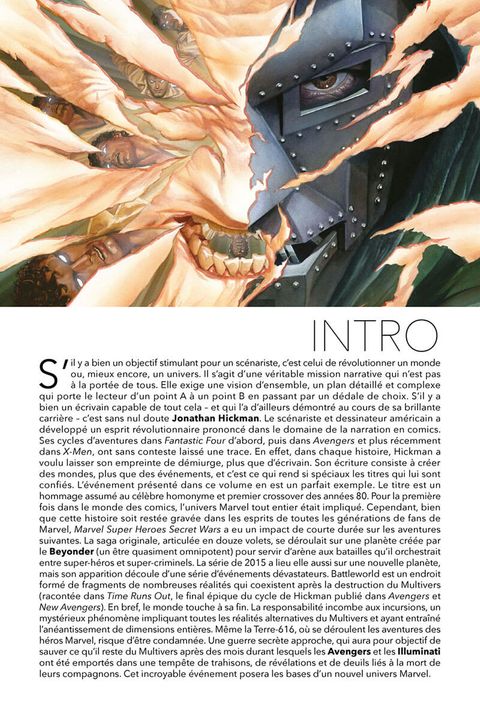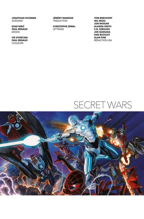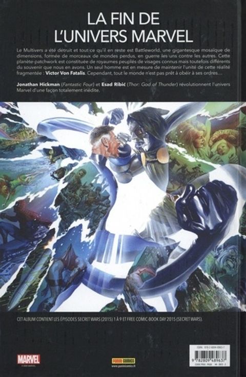 La fin de l'univers Marvel Le Multivers est détruit. Il ne reste plus que le Battleworld, un monde unique créé avec des fragments de réalités, sauvées par dieu Fatalis. Mais une poignée de héros survivants sortent de l'ombre pour réclamer justice. Est-ce que Victor von Fatalis peut encore entendre raison ? Réédition en grand format de la saga culte de Jonathan Hickman (House of X) et Esad Ribic (Loki). Contient les épisodes US : • Free Comic Book Day (2015) #Secret Wars, • Secret Wars (2015) #1-9.