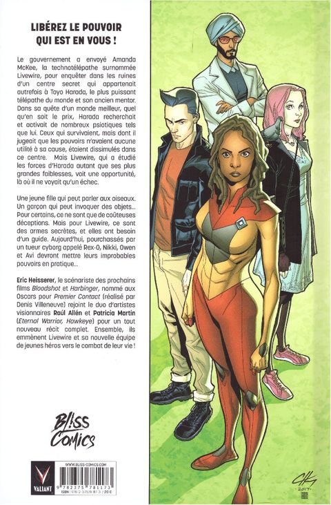Le gouvernement a envoyé Amanda McKee, la technotélépathe surnommée Livewire, pour enquêter dans les ruines d’un centre secret qui appartenait autrefois à Toyo Harada, le plus puissant télépathe du monde et son ancien mentor. Dans sa quête d’un monde meilleur, quel qu’en soit le prix, Harada recherchait et activait de nombreux psiotiques tels que lui. Ceux qui survivaient, mais dont il jugeait que les pouvoirs n’avaient aucune utilité à sa cause, étaient dissimulés dans ce centre. Mais Livewire, qui a étudié les forces d’Harada autant que ses plus grandes faiblesses, voit une opportunité, là où il ne voyait qu’un échec. Une jeune fille qui peut parler aux oiseaux. Un garçon qui peut faire apparaître des objets inanimés… pour certains, ce ne sont que de coûteuses déceptions. Mais pour Livewire, ce sont des armes secrètes, et elles ont besoin d’un guide. Aujourd’hui, pourchassés par un tueur cyborg appelé Rex-O, Nikki, Owen et Avi devront mettre leurs improbables pouvoirs en pratique… Eric Heisserer, le scénariste des prochains films Bloodshot et Harbinger, nommé aux Oscars pour Premier Contact (réalisé par Denis Villeneuve) rejoint le duo d’artistes visionnaires Raúl Allén et Patricia Martín (Eternal Warrior) pour un tout nouveau récit complet. Ensemble, ils emmènent Livewire et sa nouvelle équipe de jeunes héros vers le combat de leur vie !