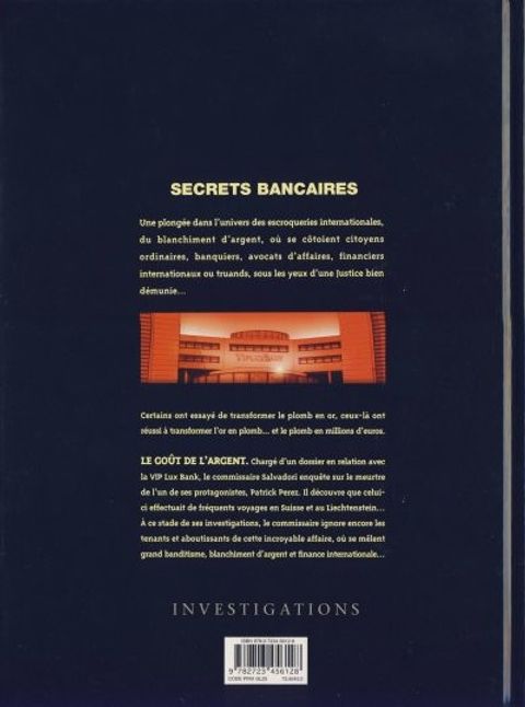 SECRETS BANCAIRES. Une plongée dans l'univers des escroqueries internationales du blanchiment d'argent, où se côtoient citoyens ordinaires, banquiers, avocats d'affaires, financiers internationaux ou truands, sous les yeux d'une justice bien démunie... certains ont essayé de transformer le plomb en or, ceux-là ont réussi à transformer l'or en plomb... et le plomb en millions d'euros. LE GOÛT DE L'ARGENT. Chargé d'un dossier en relation avec la VIP Lux Bank, le commissaire Salvadori enquête sur le meurtre de l'un de ses protagonistes, Patrick Perez. Il découvre que celui-ci effectuait de fréquents voyages en Suisse et au Lichtenstein... A ce stade de ses investigations, le commissaire ignore encore les tenants et les aboutissants de cette incroyable affaire, où se mêlent grand banditisme, blanchiment d'argent et finance internationale...