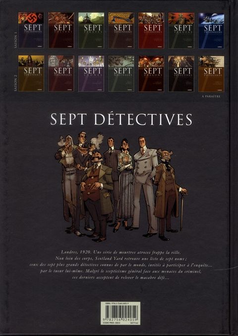 Le tome 13 de la BD Sept réunit sept détectives célèbres pour contrer un mystérieux tueur dans le Londres des années 20. Herik Hanna fait un choix astucieux en utilisant des personnages emblématiques de romans policiers du début du 20e siècle, que l on pourra aisément reconnaitre malgré leur pseudonyme. (...) Voir le commentaire