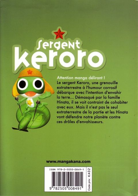 Attention man s a délirant ! Le sergent Keroro, une grenouille extraterrestre à l'humour corrosif débarque avec l'intention d'envahir la terre... Démasqué par la famille Hinata, il se voit contraint de cohabiter avec eux. Mais il n'est pas le seul extraterrestre de la partie et les Hinata vont défendre notre planète contre ces drôles d'envahisseurs.
