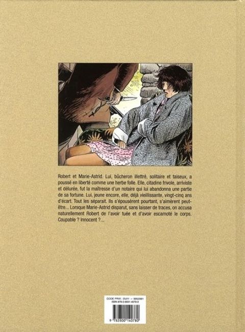 Sentiments controversés Robert et Marie-Astrid. Lui, bûcheron illettré, solitaire et taiseux, a poussé en liberté comme une herbe folle. Elle, citadine frivole, arriviste et délurée, fut la maîtresse d'un notaire qui lui abandonna une partie de sa fortune. Lui, jeune encore, elle, déjà vieillissante, vingt-cinq ans d'écart. Tout les séparait. Ils s'épousèrent pourtant, s'aimèrent peut-être... Lorsque Marie-Astrid disparut, sans laisser de traces, on accusa naturellement Robert de l'avoir tuée et d'avoir escamoté le corps. Coupableoe Innocentoe...