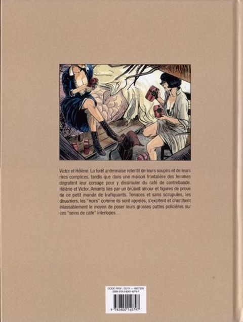 Amour et contrebande Victor et Hélène. La forêt ardennaise retentit de leurs soupirs et de leurs rires complices, tandis que dans une maison frontalière des femmes dégrafent leur corsage pour y dissimuler du café de contrebande. Hélène et Victor. Amants liés par un brûlant amour et figures de proue de ce petit monde de trafiquants. Tenaces et sans scrupules, les douaniers, les "noirs" comme ils sont appelés, s'excitent et cherchent inlassablement le moyen de poser leurs grosses pattes policières sur ces "seins de café" interlopes... Ce récit décliné initialement sous forme de diptyques est réédité dans une nouvelle présentation grand format proposant le récit complet en un seul volume.