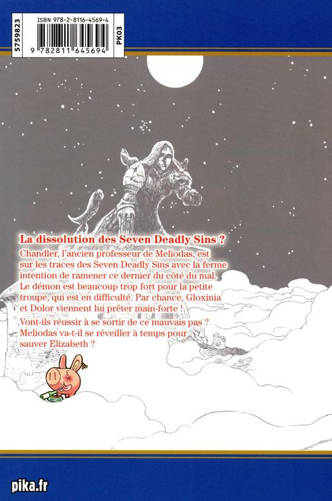 Chandler, l'ancien professeur de Meliodas, est sur les traces des Seven Deadly Sins avec la ferme intention de ramener ce dernier du côté du mal. Le démon est beaucoup trop fort pour la petite troupe, qui est en difficulté. Par chance, Gloxinia et Dolor viennent lui prêter main-forte ! Vont-ils réussir à se sortir de ce mauvais pas ? Meliodas va-t-il se réveiller à temps pour sauver Elizabeth ?