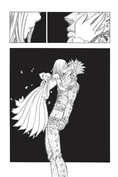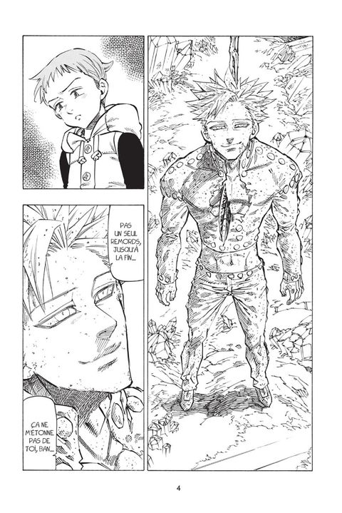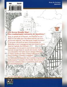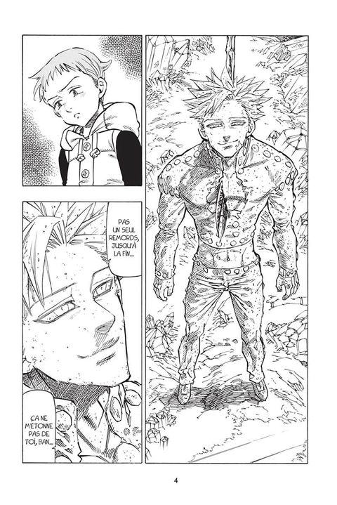 Meliodas et toute la troupe ont réussi à entrer dans la Capitale des Défunts. Très vite, un combat s'engage entre Ban et King, car ce dernier accuse son ancien camarade d'avoir tué Ellaine, sa soeur cadette. Mais alors que King avait lancé sur Ban un sort de pétrification, Ellaine intervient pour le libérer. Elle supplie son frère de protéger Ban, et King réintègre donc les Seven Deadly Sins, balayant au passage Guila, un chevalier sacré qui donnait du fil à retordre aux trois autres. Il est maintenant temps pour la petite bande de partir à la recherche de leurs reliques, des armes qui leur confère des pouvoirs magiques phénoménaux !