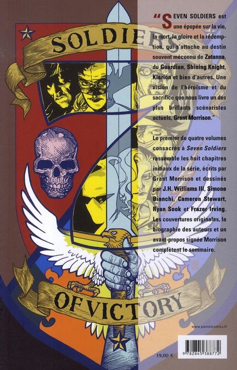 SEVEN SOLDIERS est une épopée sur la vie, la mort, la gloire et la rédemption, qui s'attache au destin souvent méconnu de Zatanna, du Guardian, Shining Knight, Klarion et bien d'autres. Une vision de l'héroïsme et du sacrifice que nous livre un des plus brillants scénaristes actuels, Grant Morrison. " Le premier de quatre volumes consacrés à Seven Soldiers rassemble les huit chapitres initiaux de la série, écrits par Grant Morrison et dessinés par J.H. Williams III, Simone Bianchi, Cameron Stewart, Ryan Sook et Frazer Irving. Les couvertures originales, la biographie des auteurs et un avant-propos signée Morrison complètent le sommaire.