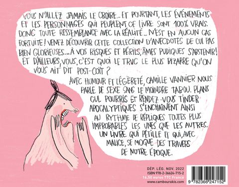 Par l'autrice de Poulou, un album décalé, inspiré de sa propre vie et de celle de ses amies, où elle raconte en dessins et en textes, les moments intimes les plus embarrassants qu'ils et surtout elles ont vécus: rendez-vous qui tournent mal, phrases inappropriées, clichés et malaises dans les rencontres. Un ouvrage drôle et grinçant, qui décomplexe et interroge la place du sexe dans nos vies.