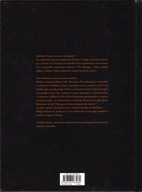 Au mois de juin 1925, Pierre Quéméneur, conseiller général du Finistère, disparaît corps et biens après un voyage avec Guillaume Seznec, un entrepreneur breton. Le corps n'a jamais été retrouvé, mais la police découvre de nombreux éléments et témoignages prouvant que Seznec a menti, ce qui lui vaut d'être condamné à perpétuité. Pourtant il n'a de cesse de clamer son innocence. Entre les partis pris et raccourcis de la police et les zones d'ombre du protagoniste principal, Éric Le Berre et Pascal Bresson (scénariste de L'Affaire Dominici et auteur de l'ouvrage Guillaume Seznec, Une vie retrouvée) accompagnés de Guy Michel au dessin, proposent dans ce diptyque leur vision documentée et empathique de cette affaire. L'album sera préfacé par le petit-fils de Guillaume Seznec qui se bat depuis des années pour prouver l'innocence de son grand-père.