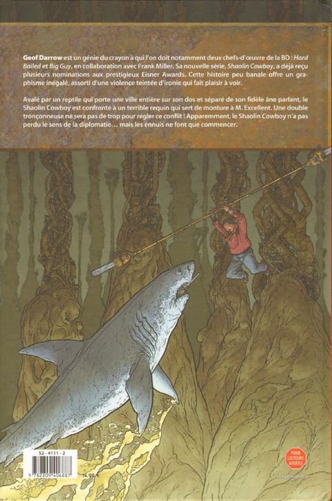 La série la plus déjantée du moment revient chez Panini. Les lecteurs retrouveront avec plaisir l'humour, la violence et les scènes abracadabrantesques de kung-fu qui émaillent les aventures du moine combattant et de sa mule parlante Lord Evilyn Dunkirk Winniferd Esq. III. Au programme de ce volume, le Shaolin Cowboy va tenter d'affronter la plus parfaite des machines à tuer conçue par Mère Nature : le grand requin blanc ! Geoff Darrow, «concept designer» sur la trilogie Matrix, est connu dans les comics pour avoir travaillé sur Hard Boiled avec Franck Miller. Il est épaulé par les réalisateurs et scénaristes Wachowski, dont la filmographie de Matrix à Speed Racer en passant par V pour Vendetta montre à quel point leur univers est imprégné de comics et de manga.