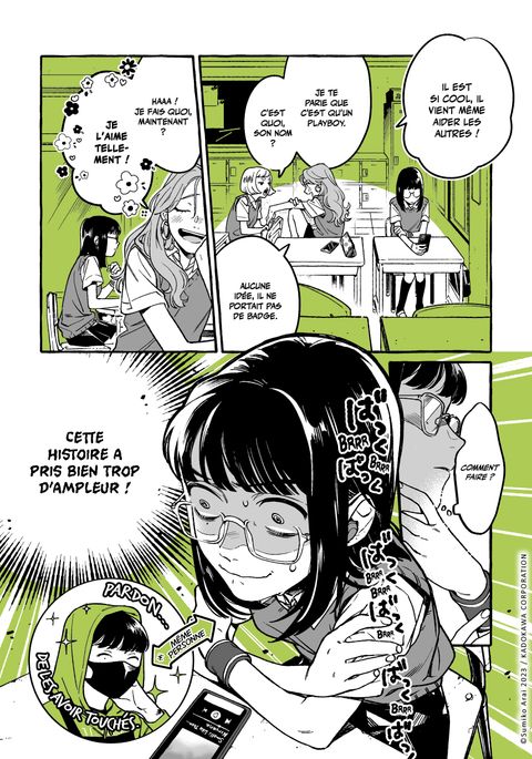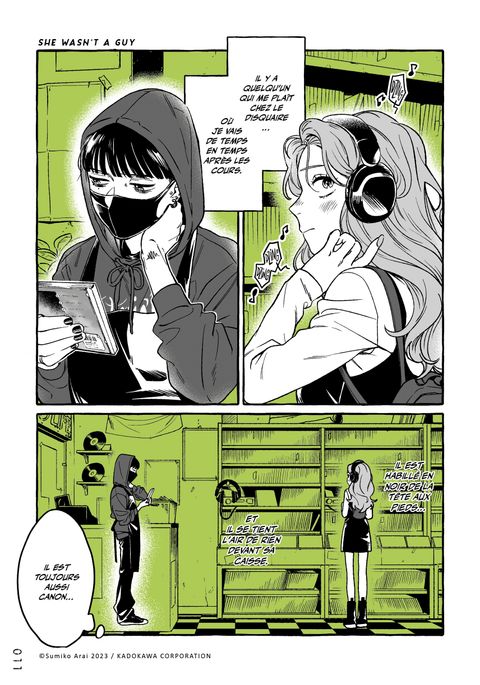 Aya, une jeune lycéenne populaire, tombe sous le charme d'un mystérieux disquaire. Leur passion commune pour le rock les rapproche de plus en plus... Mais derrière le masque du disquaire mystérieux et charismatique se cache en réalité Mitsuki, une camarade de classe d'Aya, d'habitude très discrète.Comment cet amour improbable va-t-il évoluer ? Aya va-t-elle accepter d'être tombée amoureuse... d'une fille ?!Véritable phénomène sur Twitter, She Wasn't a Guy est la première oeuvre de Sumiko Arai, autrice suivie par un million de followers !