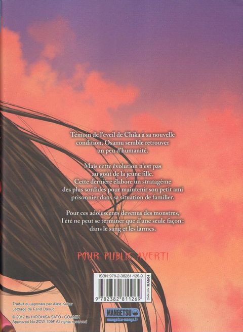 Témoin de l'éveil de Chika à sa nouvelle condition, Osamu semble retrouver un peu d'humanité. Mais cette évolution n'est pas au goût de la jeune fille. Cette dernière élabore un stratagème des plus sordides pour maintenir son petit ami prisonnier dans sa situation de familier. Pour ces adolescents devenus des monstres, l'été ne peut se terminer que d'une seule façon : dans le sang et les larmes.<em>Vampire, horreur et sensualité sont au programme de cette série résolument sanglante en cinq volumes signée Sato Hirohisa.</em>