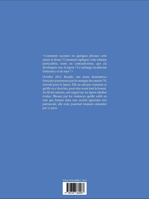 " Comment raconter en quelques phrases cette année si dense ? Comment expliquer cette relation particulière, toute en contradictions, que j'ai développée avec le Japon ? Ce mélange incohérent d'attirance et de rejet ? " Octobre 2015. Rosalie, une jeune dessinatrice française passionnée par les mangas des années 70, s'envole pour le Japon. Elle ne sait pas vraiment ce qu'elle va y chercher, peut-être avant tout la beauté. D'une expérience de wwoofing à Oishi à son premier job dans un bar de Tokyo en passant par une escapade à Kyoto, ce voyage d'un an se fait parcours initiatique. Un livre à la beauté magnétique.